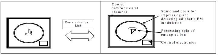 A schematic of the proposed communication link is shown in Figure 2. Two entangled atoms would be separated and maintained in separate environmental enclosures. The enclosures would prevent any environmental interaction, which could cause decoherence and end the entanglement. Today researchers have maintained single electrons and single atoms in such enclosures for over 6 months. The enclosures could be separated as desired. Each enclosure would have an identical means for generating and measuring a time varying electromagnetic field, probably a SQUID device. The electromagnetic field would be modulated in the sending enclosure, causing an adiabatic precession of the spin of the atom at a certain frequency. The receiving module would detect the modulation of the spin using identical circuitry at this characteristic frequency. This would be sending a "one". If the modulation was at another frequency, this would be sending a "zero". Ideally, one wants to make the communication as symmetric as possible, so one can hardly tell the sender from the receiver. Ideally, one would have time reversal invariance and conservation of energy. This perfect arrangement is probably not possible, but the “cut” or classical end in reversibility is as late as possible in the interaction. The modulation and detection would be done as an adiabatic interaction, without any permanent change in the state of the entangled atoms. In practice, probably multiple entangled ions would be used in each send/receive module to enhance reliability and performance.