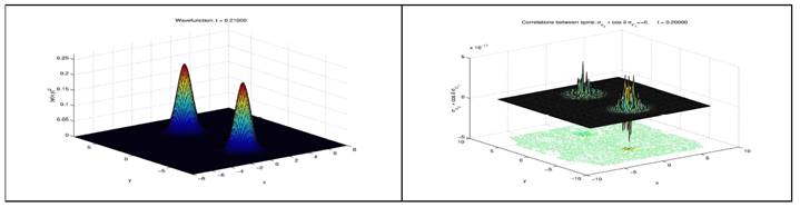 We used the causal theory to calculate the relative orientation of the spin vectors for two entangled particles as they both pass through a magnetic field. This calculation was first done by Dewdney et al, “Causal account of EPR spin correlations,” J. Phys. A: Math. Gen. 20, 4717-4732 (1987). It is also discussed in P. Holland, The Quantum Theory of Motion, (Cambridge U., Cambridge, England, 1993). Our results (calculated by Paul Alsing) were in agreement, showing that the spin of each particle is rotated as it passes through the magnetic field, and that during this entire process Sz1(t) + Sz2(t) =0. In this equation we have shown the spins as a function of time, and total spin remains zero at all times. The particles are deflected in opposite directions (splitting of the beam). The final state is Sz1 = ½ and Sz2 = -½. Thus the spins remain continuously correlated during the entire process. A plot of the wavefunctions for a time after the two particles have passed through the magnetic field is show in the left side of Figure 2. Here x is about the same for each wavepacket, and y is different due to the separation of the wavepackets by the magnetic field. The left side shows the deviation from perfect spin correlation, and is of the order of 10^-17, the limits of the calculation.