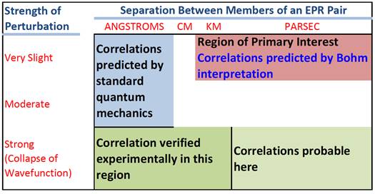 Our current understanding of correlations in EPR pairs, based on experiments and our calculations, is shown in Figure 3, where the distance between the pairs is plotted horizontally, and the strength of the perturbation on each member of the pair is plotted vertically. The only experimentally explored and verified region is for strong interactions which use conventional quantum mechanical measurements, for separations from microns (entangled ions) to km (photons).